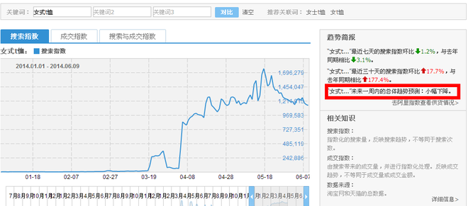 現(xiàn)階段,比如我準(zhǔn)備推女式t恤,那么就需要我們先看看大盤是個(gè)什么情況,選擇還在熱銷中的寶貝去推,不能盲目投放。這個(gè)簡(jiǎn)單,通過兩方面來看:淘寶指數(shù)和阿里指數(shù)  通過這些數(shù)據(jù)來看,整體行情還是可以的,市場(chǎng)行情基本處于平穩(wěn)的狀態(tài),還處于可推廣得范圍。