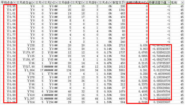 通過量子后臺(tái)下載關(guān)鍵詞報(bào)表:  使用公式:PPC高出價(jià)=轉(zhuǎn)化率單品毛利潤(rùn);關(guān)鍵詞潛力值=(產(chǎn)出-花費(fèi))/花費(fèi);進(jìn)行篩選,潛力值高的,重點(diǎn)優(yōu)化,高于最高點(diǎn)擊單價(jià)的關(guān)鍵詞,重點(diǎn)降低PPC。  將最高出價(jià)降序排列,遠(yuǎn)遠(yuǎn)低于平均點(diǎn)擊出價(jià)的關(guān)鍵詞,很難實(shí)現(xiàn)優(yōu)化效果的關(guān)鍵詞,可以果斷刪除。  對(duì)于已經(jīng)優(yōu)化到瓶頸的關(guān)鍵詞,我們可以刪除,保留在EXCEL里面,然后重新建立一個(gè)計(jì)劃,區(qū)域時(shí)段,都和老計(jì)劃一樣,將這些詞重新優(yōu)化起來,這樣關(guān)鍵詞的PPC就反向的降低下來了。  PPC最高出價(jià)=2.23%45=1.035>實(shí)際PPC:0.88