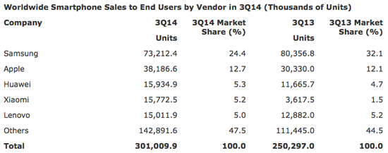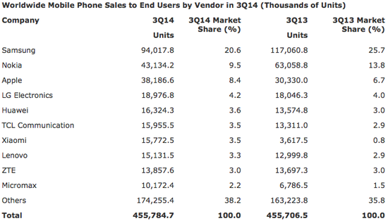 2014年第三季度世界手機(jī)品牌銷量排名