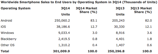 2014年第三季度世界智能手機(jī)銷量按操作系統(tǒng)排名