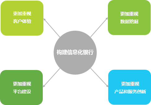 隨著互聯(lián)網(wǎng)金融的興起和發(fā)展,大數(shù)據(jù)時代的到來,商業(yè)銀行面臨著支付脫媒、融資脫媒、信息脫媒等多種挑戰(zhàn),同時也為商業(yè)銀行的轉(zhuǎn)型發(fā)展提供了機遇。借助新興互聯(lián)網(wǎng)金融發(fā)展模式,商業(yè)銀行不斷進行互聯(lián)網(wǎng)化發(fā)展探索和創(chuàng)新,發(fā)揮自身資金雄厚、風(fēng)控完善、信譽度高等優(yōu)勢,從流程、數(shù)據(jù)、平臺和產(chǎn)品等層面系統(tǒng)推進信息化銀行建設(shè),從而構(gòu)建面向未來的、可持續(xù)的發(fā)展模式。主要表現(xiàn)在以下四個方面: