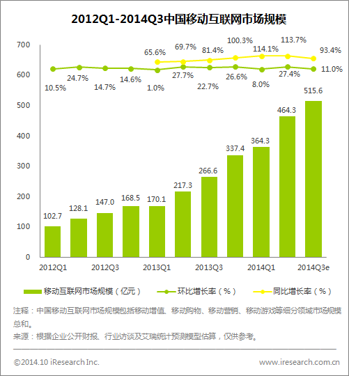 艾瑞咨詢數(shù)據(jù)顯示,2014年第三季度中國移動(dòng)互聯(lián)網(wǎng)市場規(guī)模達(dá)到515.6億元,環(huán)比增長11.0%,同比增長93.4%。