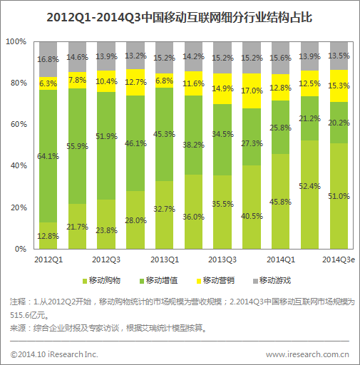 艾瑞咨詢數(shù)據(jù)顯示,2014年第三季度移動(dòng)購物占比達(dá)到51.0%,移動(dòng)增值占比為20.2%,移動(dòng)營銷占比15.3%,移動(dòng)游戲占比13.5%。移動(dòng)購物占據(jù)移動(dòng)互聯(lián)網(wǎng)經(jīng)濟(jì)半壁江山;移動(dòng)增值進(jìn)一步受到其他細(xì)分領(lǐng)域的排擠,占比持續(xù)降低;由于移動(dòng)廣告平臺(tái)開始出現(xiàn)分化,程序化購買產(chǎn)業(yè)鏈初步形成,新的移動(dòng)廣告投放方式刺激移動(dòng)營銷市場實(shí)現(xiàn)新的增長。