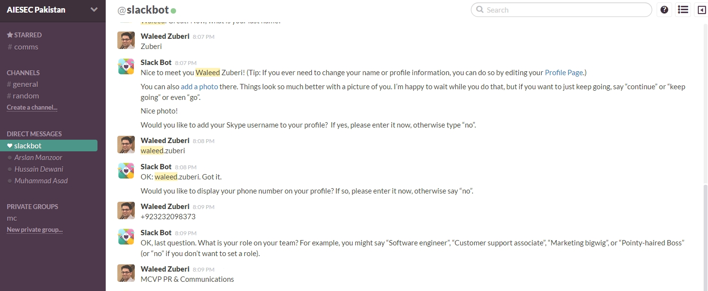 Slack等web應(yīng)用采用了重疊式指南的方法,使用“指導(dǎo)標(biāo)記”凸顯UI中的重要部分進(jìn)而說明其功能。另外,Slack還使用了聊天機(jī)器人的方法幫助用戶創(chuàng)建個(gè)人檔案??紤]到Slack是一款聊天應(yīng)用,這一方法合情合理,另外,“Slackbot”還會(huì)帶領(lǐng)用戶填寫手機(jī)號碼等個(gè)人資料信息并以對話的形式顯示用戶名。