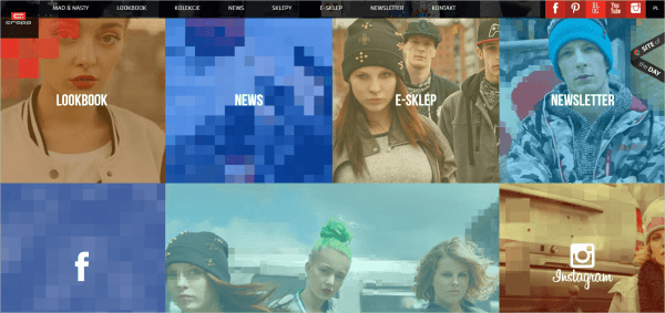 Cropp 具有大膽張狂的個性,正如其布局所展現(xiàn)。鼠標懸停在任意圖片上時,圖片會像素畫并變得難以識別,從而牢牢抓住人的注意力。頂部的導航欄在所有頁面均保持一致,而主頁則基本上就是導航欄中各個選項的高調(diào)視覺呈現(xiàn)。這個網(wǎng)站的布局牢牢抓住了像素化這一創(chuàng)意,其所有照片和視頻都以方塊形式安置,很像是經(jīng)過像素化后的圖片。
