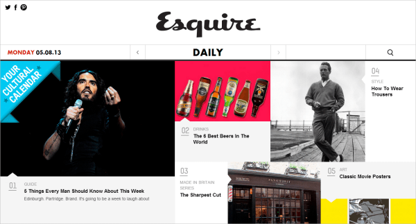 這個網(wǎng)站的布局簡單、清爽、易于理解。Esquire的大標題就是單調(diào)的黑與白。其文章導讀使用彩色,能夠吸引讀者眼球。懸停特效也很簡單,在導讀標題下方有說明內(nèi)容。導航欄位于網(wǎng)站中間位置,功能上很類似報紙通過折頁位置上方的內(nèi)容引起讀者的興趣。其圖像、顏色和簡介標題也很能吸引用戶注意。
