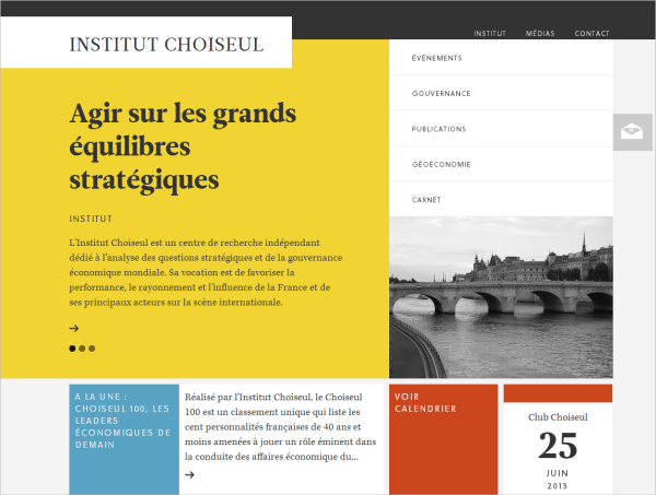 Intitut Choiseul 采用了很有趣的塊狀布局,彼此之間就像拼圖一樣契合。層疊式外觀以及色塊能夠有效確立風格。繼續(xù)向頁面下方滾動,其布局轉(zhuǎn)換成比較傳統(tǒng)的網(wǎng)格形式,但其實每個故事都位于一個大小各不相同的塊內(nèi),營造出一種有趣而動態(tài)的美感。不同的色塊標志著網(wǎng)站的不同內(nèi)容,因此比較方便導航和閱讀。這家網(wǎng)站從質(zhì)量上說比較精良,和自身設立目的相符。