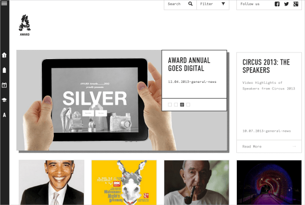 Award 崇尚創(chuàng)意,其中性的設計美學為設計師的作品搭建起了有效的展現(xiàn)平臺。網(wǎng)格化布局沒有任何會轉(zhuǎn)移人注意力或產(chǎn)生沖突的邊邊角角,一切以設計師為主角。但其有趣的懸停效果采用了不錯的像素化投射陰影。導航欄固定在頁面左側,搜索和篩選功能固定在頂部。這一導航布局非常適合于展示網(wǎng)站內(nèi)容。