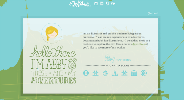 Abby Putinski采用了原創(chuàng)的方式表現(xiàn)自己的作品集網(wǎng)站,從而彰顯出了自己作為一名創(chuàng)意插畫家和圖形設計師的獨特性。在加載時,屏幕上會顯示一個具有動畫效果的介紹窗口邀請用戶深入探索她的作品。在關閉這個窗口后,可以看到一個匯集了她各次旅程的地圖。這個網(wǎng)站實際上并沒有嚴格意義上的布局,它不存在明確的界限,非常自由開放,因此導航體驗異常有趣。用戶隨意點擊一幅作品時,類似明信片框架內(nèi)的圖片就會落入頁面,進而開始循環(huán)介紹有關旅途的創(chuàng)意。導航欄固定在頂部,可以隨時使用。