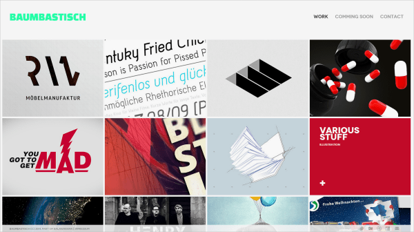 Davy Rudolph 作品集的網(wǎng)格布局簡單、簡約,讓用戶感到非常直接而自然。其每個頁面都只有兩種顏色,并且為當前頁面所獨用。在點擊任一項目作品后,作品展示將變成頁面主角,同時主導航面會消失。對于一個作品集網(wǎng)站采用這種方法,我個人最贊賞的是其既有個性,同時個性又不至于搶占設計師作品的風頭。