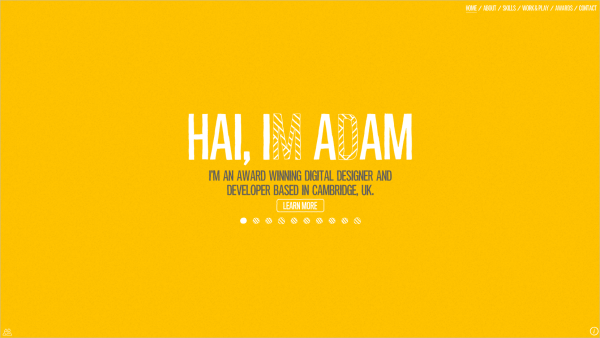 這個網(wǎng)站的有趣之處在于它似有似無的布局。網(wǎng)站使用類似于Flash的動畫文字打造,動畫效果會在整個網(wǎng)站內(nèi)持續(xù)自動播放。即便不點擊查看各個不同內(nèi)容分類,用戶也能通過動畫幻燈片了解到設計師的作品情況。其動畫效果貫穿始終,同時展示效果也很可愛,充分表現(xiàn)出了設計師極具創(chuàng)意的個性。