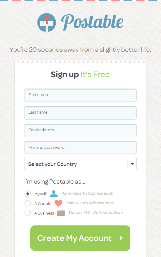 Postable 的理念非??蓯郏黄鋾ㄟ^郵件給用戶發(fā)送設計精良的感謝卡,另一方面網(wǎng)站的設計外觀類似于郵政郵遞的感覺。網(wǎng)站的整體設計和布局在傳達網(wǎng)站理念方面扮演了至關重要的角色。網(wǎng)站背景采用了紙張材質(zhì),頂部邊緣類似老式的信封。將真實生活中的感覺放到Web上能夠帶來非常令人舒適的韻味,就好像你真的在筆記本上書寫一般。