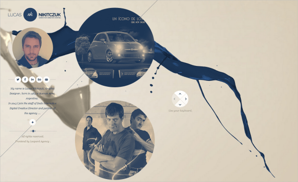 我個人非常喜歡Lucas Nikitczuk作品集的布局,原因就在于其表現(xiàn)出了Lucas的水平。網(wǎng)站開門見山,主頁是設計師的簡短自傳以及作品。圓圈圖形帶來了友好和流程的美感。背景上潑濺的油漆奠定了網(wǎng)站的開放和自由特色。導航欄簡單好用,在整個網(wǎng)站內(nèi)保持一致。另一個值得稱道的地方是,用戶可以使用方向鍵進行導航,這一點對于筆記本用戶來說非常方便。