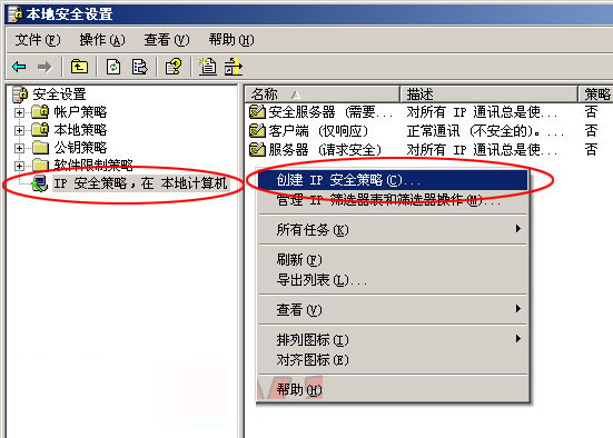 第二步:點“IP安全策略,在本地計算機”,然后在右欄空白處點右鍵,在彈出的菜單中點“創(chuàng)建IP安全策略(C)”如圖: