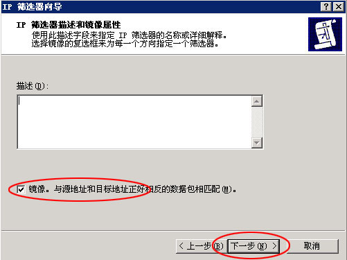第十六步:在IP篩選器描述和鏡像屬性中輸入描述并選中鏡像。然后點下一步