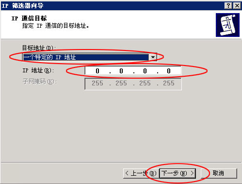 第十八步:在IP通信目標(biāo)的目標(biāo)地址中選擇“一個特定的IP地址”,把IP地址填寫為你要限制的IP,如192.168.0.199,然后點下一步
