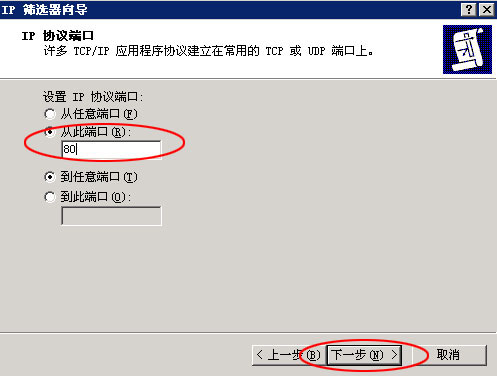 第二十步:在IP協(xié)議端口選擇從此端口,并填上你要限制的端口,如80,然后點下一步