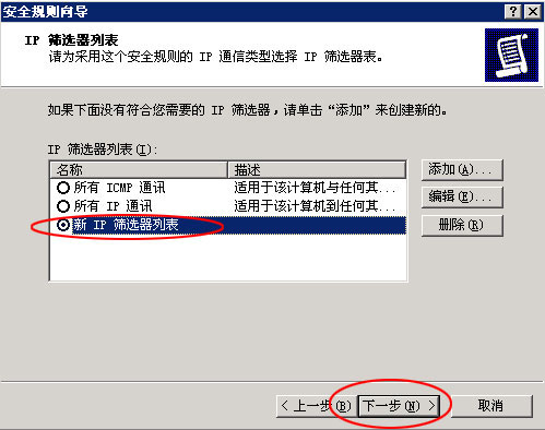 第二十二步:在IP篩選器列表點確定,然后選中“新IP篩選器列表”(剛才創(chuàng)建的),點下一步