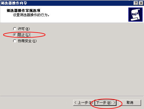 第二十五步:在設(shè)置篩選器操作的行為中選擇“阻止(L)”,然后點下一步