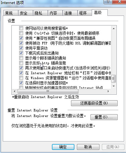 2、在高級(jí)選項(xiàng)框中將“顯示友好HTTP錯(cuò)誤信息”的勾選去掉。