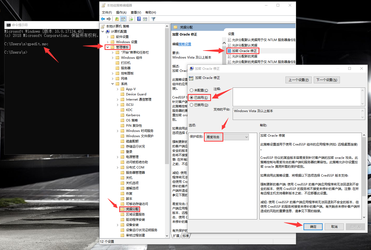 計(jì)算機(jī)配置>管理模板>系統(tǒng)>憑據(jù)分配>加密Oracle修正 選擇啟用并選擇易受攻擊。