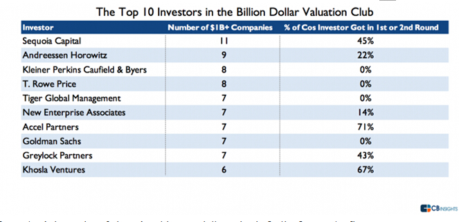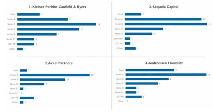 根據(jù)風(fēng)投公司所投資的具有上市潛力的創(chuàng)業(yè)公司數(shù)量——CBInsights把公司的估值作為是否具有上市潛力的衡量標(biāo)準(zhǔn)——排在前三位的風(fēng)投公司分別是KPCB風(fēng)投公司(Kleiner Perkins Caufield & Byers),紅杉資本(Sequoia Capital)和Accel Partners。但是這三家風(fēng)投公司各有側(cè)重點(diǎn):KPCB風(fēng)投公司習(xí)慣在中間階段開(kāi)始投資,而Andreessen Horowitz的投資集中在種子投資和A輪投資。紅杉資本和Accel Partners則更多地參與創(chuàng)業(yè)公司的A輪投資。
